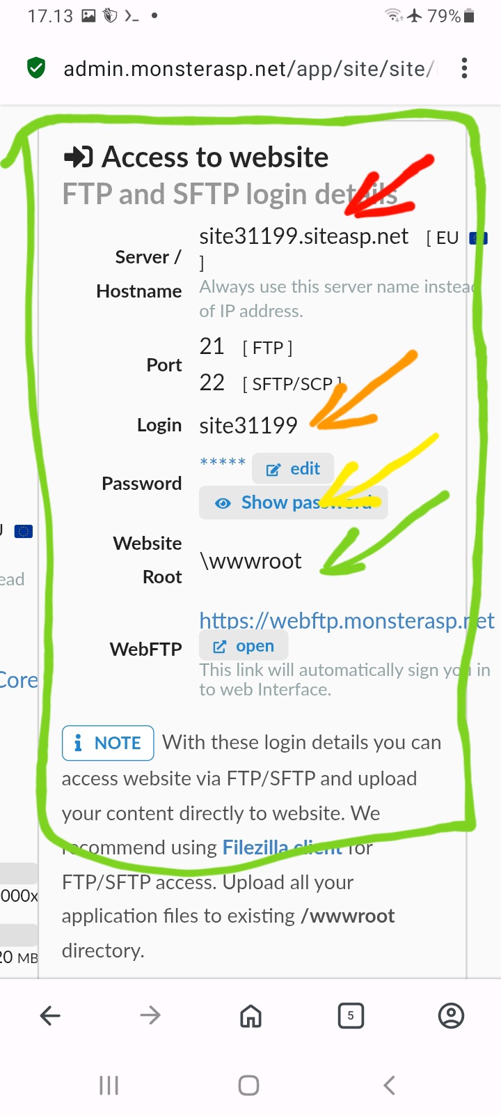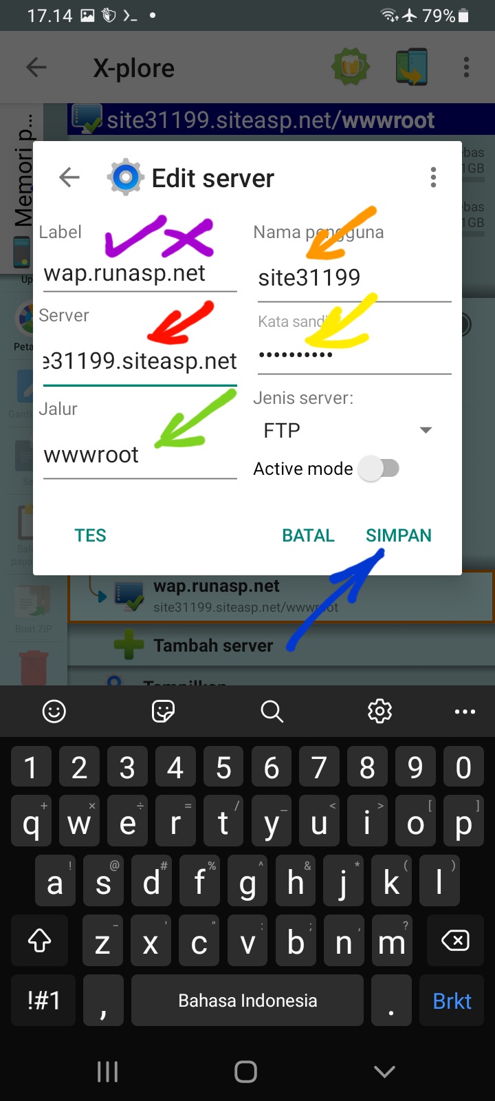 Down lod X-Plore android cari di play store. buka bagian ftp. Klik tambahkan server. isi data sesuai data hosting tadi.. isi swmua data sesuai warna tanda panah.