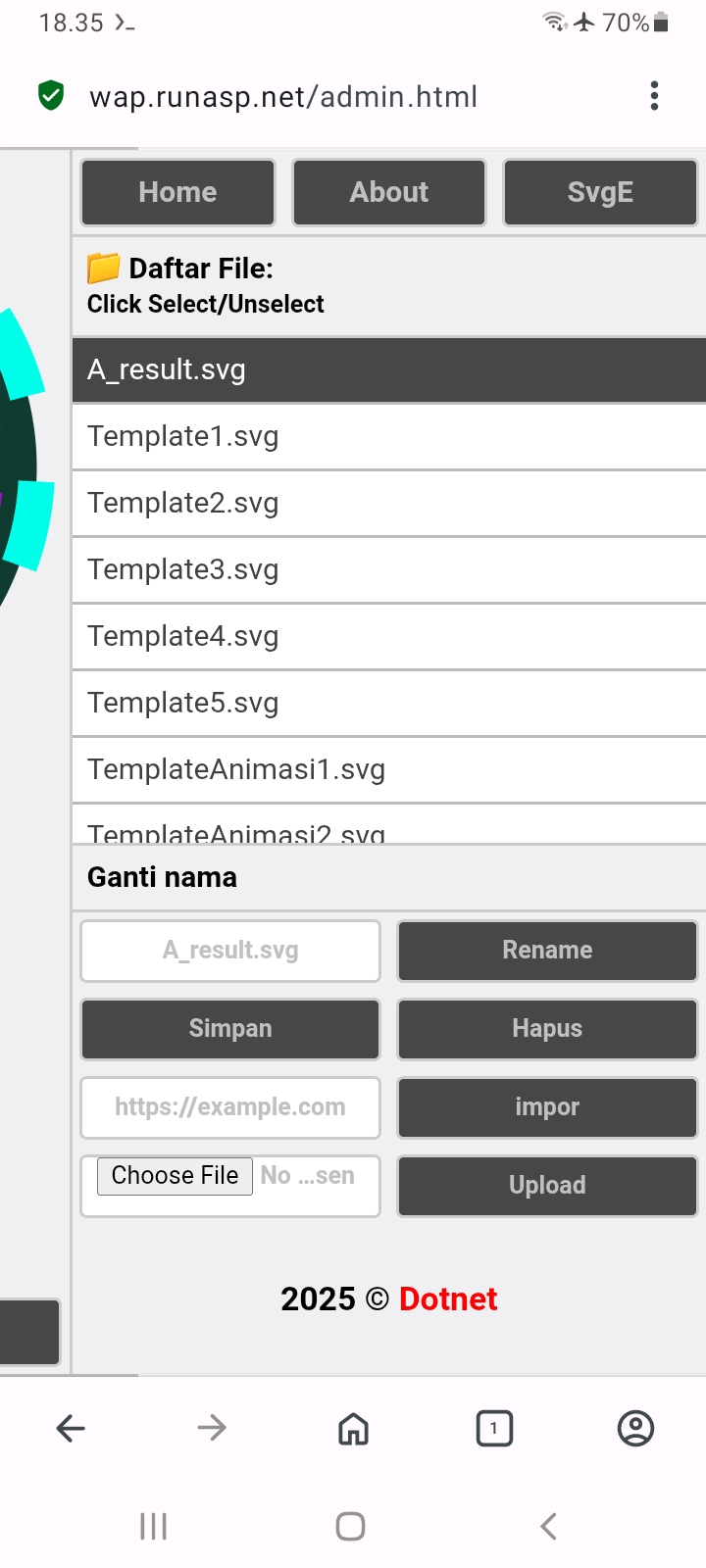 Kalo semua udah selesai... udah tinggal kunjungi alamat web sobat yang di daptarin tadi. untuk mengelola kontent template svg. bisa edit,rename,import via http/https,upload,hapus... bisa kunjungi [http://websobat.com/admin.html]. contoh: wap.runasp.net/admin.html